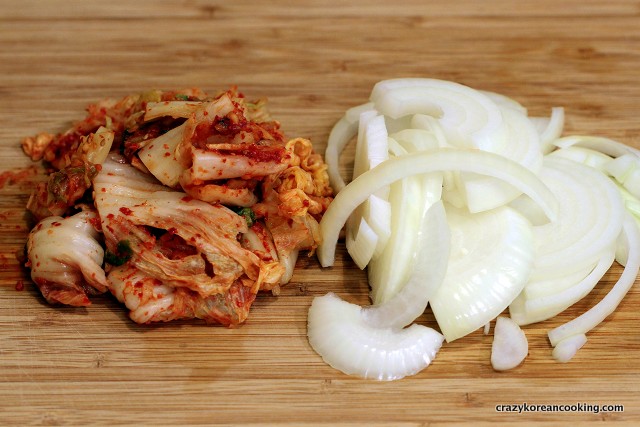 1. Prepare Kimchi and vegetablesCut 250g of Kimchi (about ⅛ of a whole Napa Cabbage Kimchi) into bite-sized pieces (about 1 inch long). Peel and wash 1 medium sized onion. Cut it in half and slice into ¼ inch pieces. Cut off the root ends of 3 green onions and wash them thoroughly. Cut them into 1½ inch pieces. |