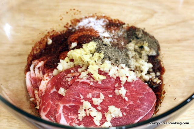 2. Season porkMix 2 tablespoons of gochugaru (red chili flakes), 3 tablespoons of soy sauce, 1 tablespoon of minced garlic, 1 teaspoon of minced ginger, 2 teaspoons of sugar, ½ teaspoon of black pepper and 1 tablespoon of rice wine (optional). Cut pork into big bite-sized pieces. Add 400g of pork and mix well. Reduce the amount of red chili flakes to make it milder. |