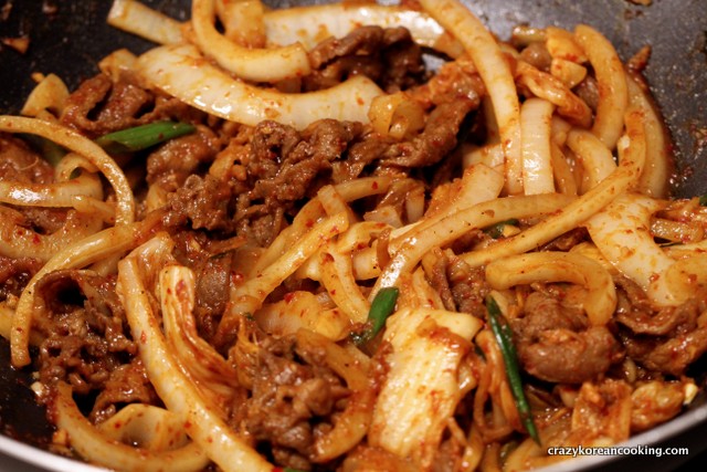 4. FinishAdd sliced onions and green onions and sauté on medium heat for 2 minutes or until pork is cooked through. Turn off the heat and add 1 teaspoon of sesame seeds and 1 tablespoon of sesame oil. Mix well. |