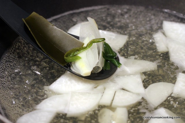 10. Finish up brothRemove anchovies, kelp, onion and green onions from the broth. Keep the radish in the soup. |