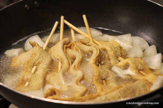 Flat rectangular fishcake is used for Korean style fishcake soup. You can, however, use other kinds of various shapes and colors. In this recipe, skewers are used, but they are not necessary.