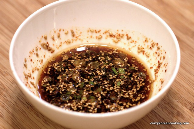 13. Make dipping sauce (optional)In a bowl, mix 2 tablespoons of soy sauce, 2 tablespoons of water, ¼ teaspoon of minced garlic, 1 teaspoon of sesame oil, ½ teaspoon of sesame seeds, ½ teaspoon of gochugaru (red chili flakes), 1 tablespoon of chopped green onions and sliced green chili peppers. |