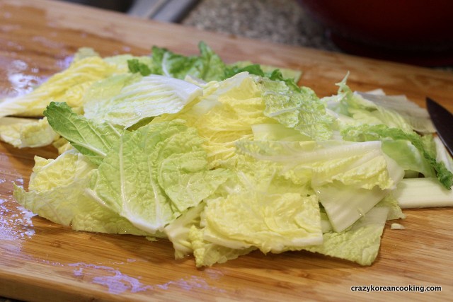 1. Prepare Napa CabbageWash and cut (or tear) 350g (about ¼ or less depending on the size) of Napa cabbage into 2” to 3” (or 5 cm)-long strips. If the leaves are too big cut in half length wise first. |