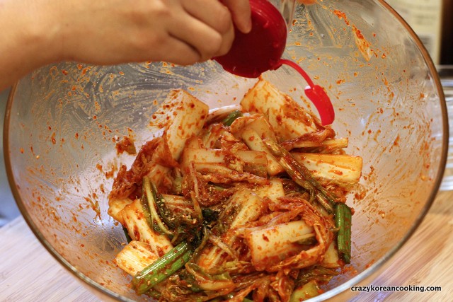6. Add seasoning ingredientsAdd the cut green onions, 3 to 3½ tablespoons of anchovy fish sauce, 2 teaspoons of sugar, 1 tablespoon of minced garlic and ½ teaspoon of minced ginger. Mix well. The amount of anchovy fish sauce may vary depending on how long you salted the cabbages and depending on the brand of the fish sauce. Add gradually while tasting. You can also use shrimp fish sauce instead. You can add more or less sugar to your liking. |