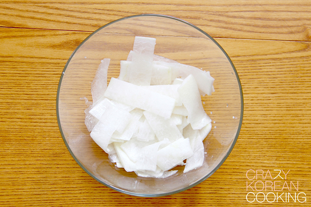 1. Make pickled radish 1 (Optional)Peel, wash and slice 8 oz (227g) Korean radish very thinly (⅜” x 2” x 1/16” or 1cm X 5cm X 0.2cm). In a bowl, mix the sliced radish and 2 tablespoon of coarse sea salt. Let it sit for 30 minutes. (Optional: If it’s too salty, rinse once and squeeze the water out.) |