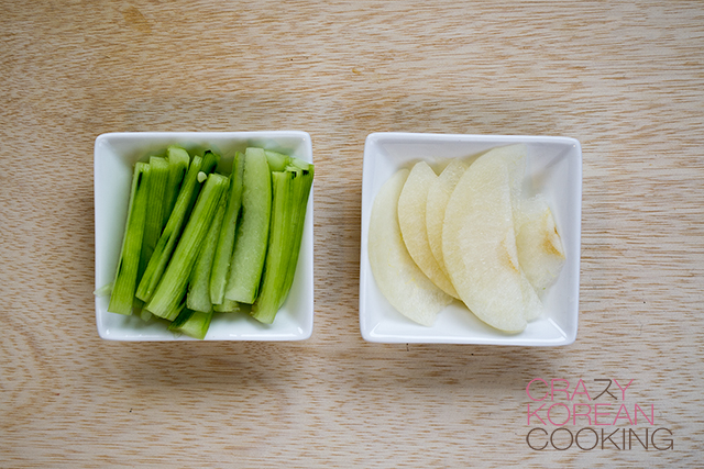 5. Prepare garnishWash, peel and slice (or julienne) ¼ Korean pear. Wash & peel ½ cucumber. Remove any seeds. Julienne the cucumber. |