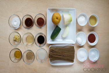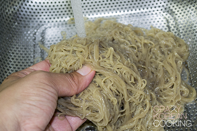 6. Cook noodlesCook the buckwheat noodles in boiling water until soft (1-5 min depending on the brand) and drain water. (Follow the directions of the package you have. Cooking time may vary depending on the brand.) It is important NOT to overcook the noodles. Rinse the noodles in COLD water immediately to stop cooking. Continue to rinse in COLD water while gently running through the noodles with your fingers until there is no starch coming out. |