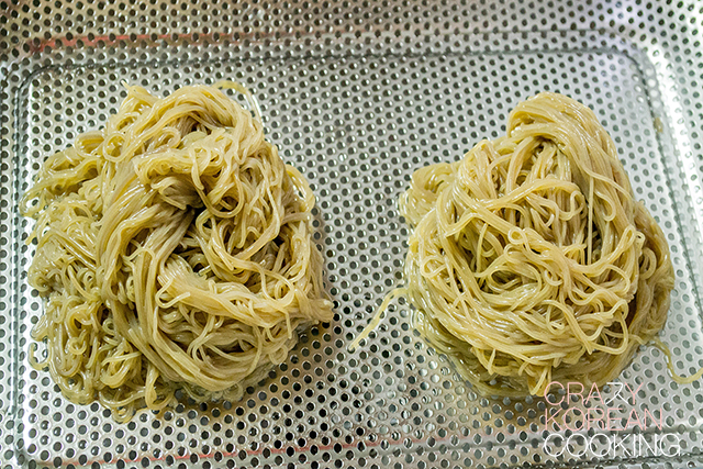 7. Cook noodlesCompletely drain the water out in a strainer. Divide the noodles into 2 servings right away and set it aside. It will be hard to divide the noodles later since they becomes sticky. Prepare the noodles just before serving Naengmyeon noodles become soggy and sticky very quickly. |