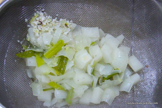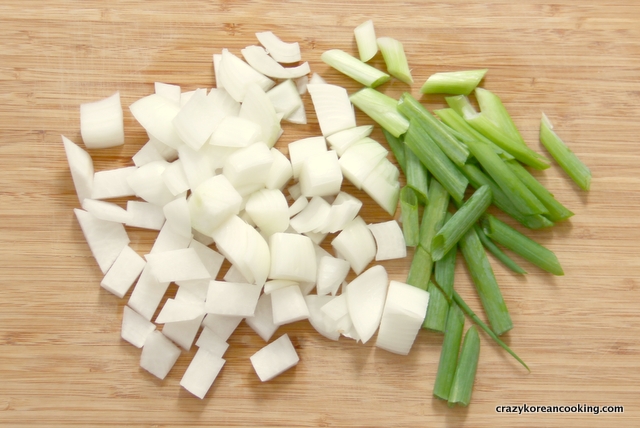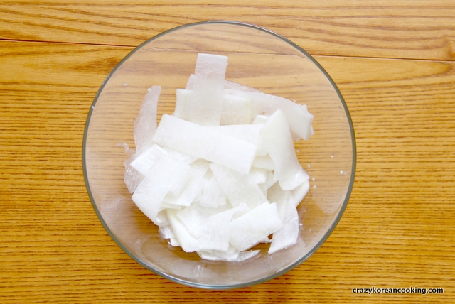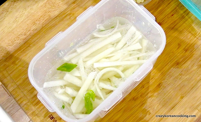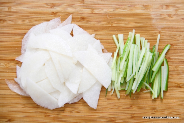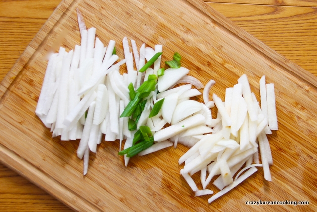 Peel, wash and julienne (or slice) ¼ onion, ½ green onion, ½ Korean pear and 4 oz (100g) Korean radish.