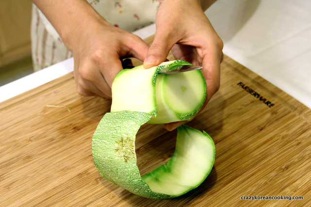 Wash & peel ½ cucumber. Cut into 2” (or 5cm) long pieces and peel the flesh thinly while turning to create a thin sheet of cucumber flesh. Do not use the middle part (seeds). Julienne the cucumber flesh. (If this method is too hard, just use the regular method of julienning cucumber.)