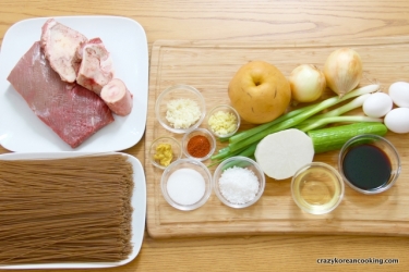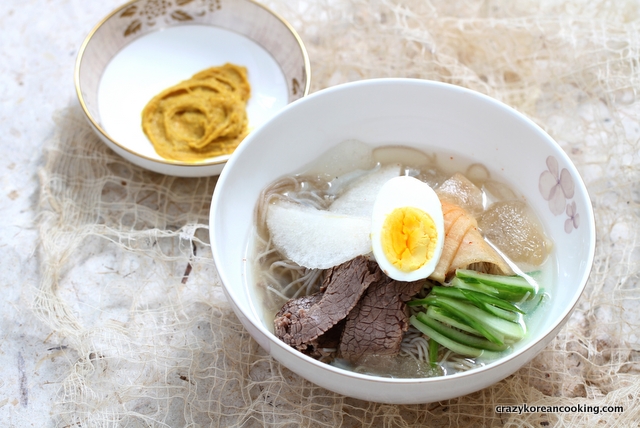 Radish kimchi water: If you don’t have time to make it, just increase the about of beef broth. Or if you happened to have radish water kimchi (dongchimi), simply use the juice from the kimchi.