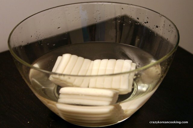 If the rice cake is frozen, soak it in room temperature water for at least 30 minutes. Soaking is not necessary for fresh-made (soft) rice cake. Cut the rice cake into 4-5 inch lengths if not pre-cut.