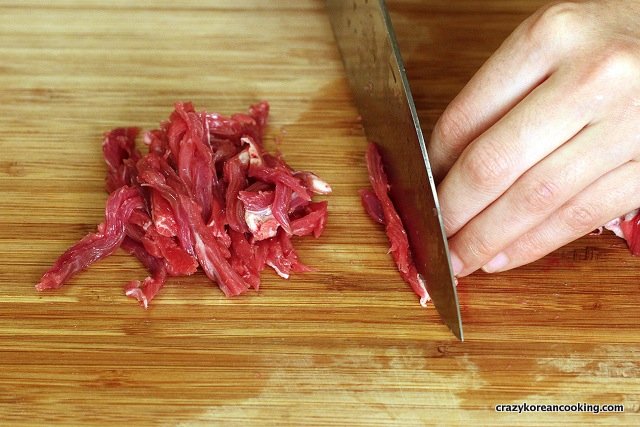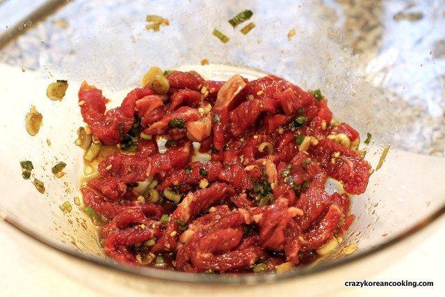Use ⅔ of the marinade to marinate julienned beef. Mix thoroughly by hand. Let it sit for at least 10 min.