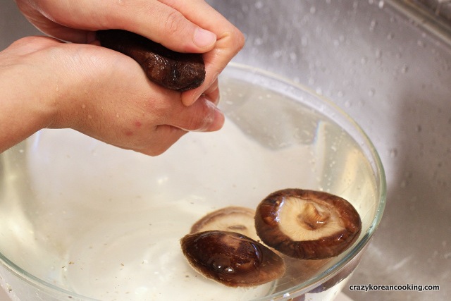 Wash soaked shiitake mushrooms thoroughly. Squeeze out water.