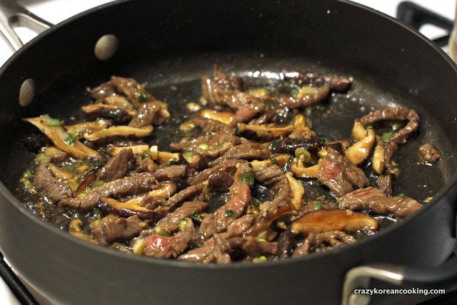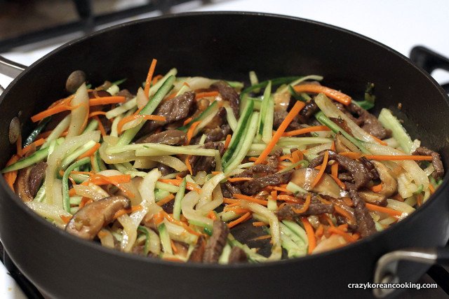 Add 1 tablespoon of vegetable oil to the same pan. Add julienned onions, carrots and cucumber and cook on high heat for 2 minutes. Add more vegetable oil if the vegetables start to stick to the pan. Set the cooked beef and vegetables aside in a bowl.