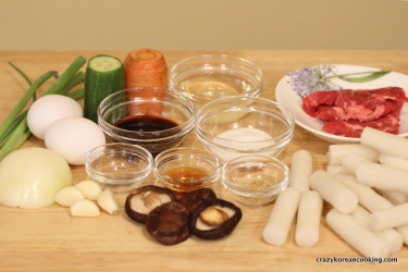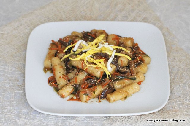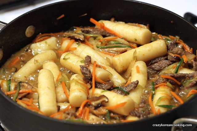 In the same (but empty) sauce pan, add rice cake, 3 tablespoon of soy sauce, 2 tablespoon of sugar and 1¼ cup of water. Cook on high heat uncovered for 5 min while stirring. Then, add the beef and vegetables back into the pan. Cook on high heat uncovered until all the liquid is mostly reduced, stirring frequently. *If rice cake is not soft at the end, add a little bit of water and cook until it becomes soft.