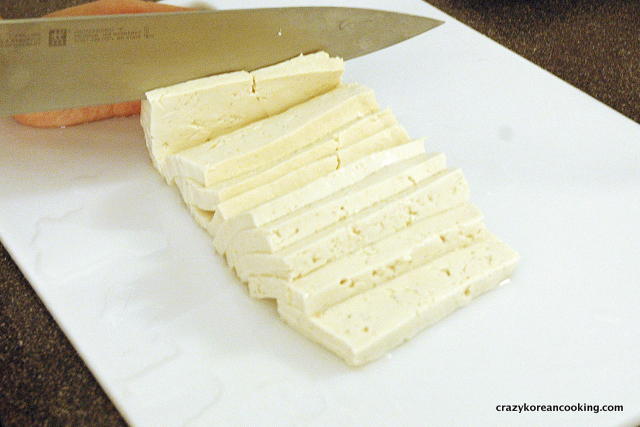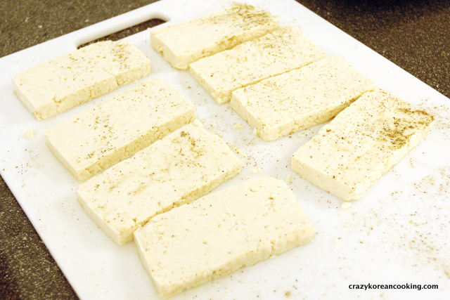 1. Wash & CutGently rinse the tofu under running water. Dry it with a kitchen towel. Slice the tofu into ⅜” (1 cm) rectangles. One average size Korean tofu block usually yields 7 to 8 slices. The size may vary depending on the brand. You can also cut into smaller pieces as long as the thickness is about 1 cm. |