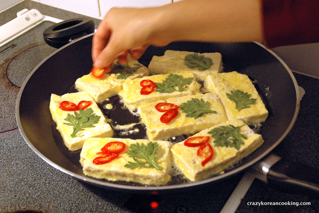 7. PanfryCoat a nonstick pan with vegetable oil and preheat for 1 minute. Add tofu slices. Add sliced chili peppers and ssukgot (crown daisy) on top for decoration. Cook until the bottom is light golden brown. If you pan-fry on high heat, it will be crispier. If you want softer texture, cook on low heat. |