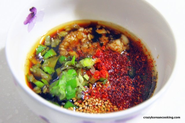 4. SeasoningMix all the seasoning ingredients in a bowl (4 teaspoon of soy sauce, 1 teaspoon of sesame oil, 1 teaspoon of red chili pepper flakes, 1 teaspoon of minced garlic, 1 teaspoon of chopped green onion, 1 teaspoon of sugar, ½ teaspoon of black pepper and 1 teaspoon of sesame seeds). |