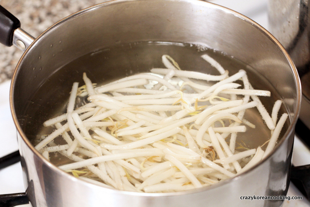 24. Season mung bean sproutsSeason mung bean sprouts with the following and mix well with your hand: ⅛-¼ teaspoon of salt, ¼ teaspoon of gukganjang (soy sauce for soup), ½ teaspoon of minced garlic, 1 teaspoon of sesame oil, 1 teaspoon of chopped green onions, a pinch of black pepper and ½ teaspoon of sesame seeds. |