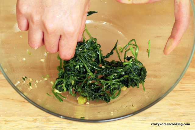 23. Season chuinamulSeason chuinamul (aster scaber) with the following and mix well with your hand: ⅛-¼ teaspoon of salt, ¼ teaspoon of gukganjang (soy sauce for soup), ½ teaspoon of minced garlic, 1 teaspoon of sesame oil, 1 teaspoon of chopped green onions and ½ teaspoon of sesame seeds. |