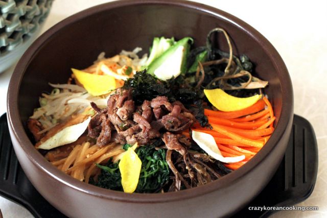 If you want to stay true to the traditional pyeonyang bibimbap, make sure to include mung bean sprouts, cooked beef, seaweed garnish and diamond shaped egg garnishes along with other vegetables and greens of your choice.