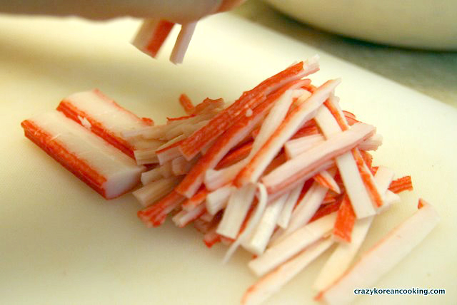 Remove the wrapper from the crab sticks. Cut them into 2” (or 5cm) length and tear each piece into strips.
