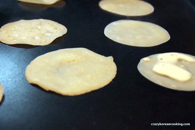 Preheat a non-stick pan on low heat for 1 min. Pour about 1 teaspoon of flour mix on the pan in circular motion so it spreads very thinly to create a circle of diameter 3” (8cm). Cook on low heat. Flip when one side is cooked. Repeat.