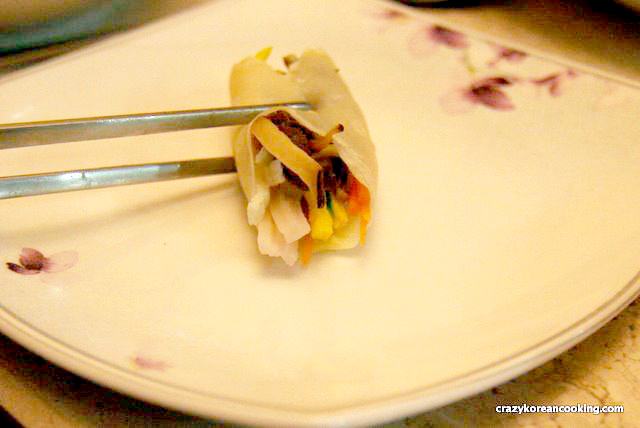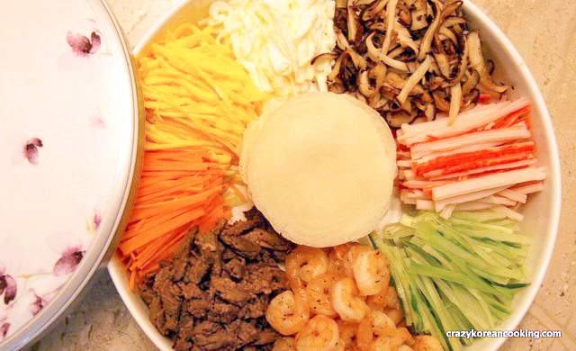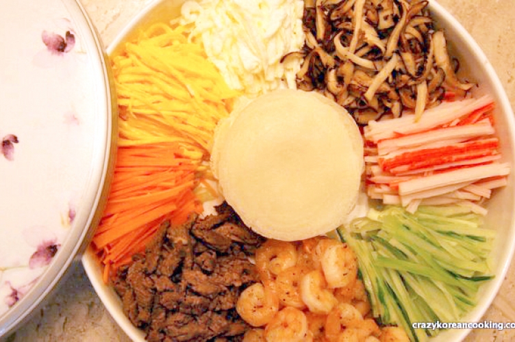 Gujeolpan was one of the ancient Korean royal dishes, served to the king. The name, gujeolpan, originated from a wooden tray with 9 compartments. This tray was used to serve a dish with 8 different fillings and small thin wraps. Number 9 has a meaning of “all” and was believed to bring good luck. Today the word gujeolpan is used to refer to the the food rather than the tray.