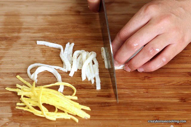 Once they are cooled down, cut the cooked eggs into thin strips. If the eggs are still warm, you won’t be able to cut cleanly.