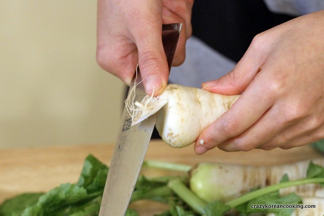 2. Remove dirtRemove dirt from the area where the stems connect to the radish by using a knife. |