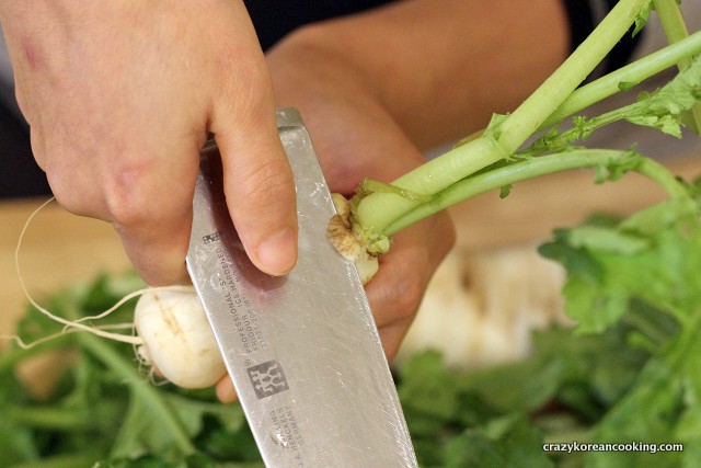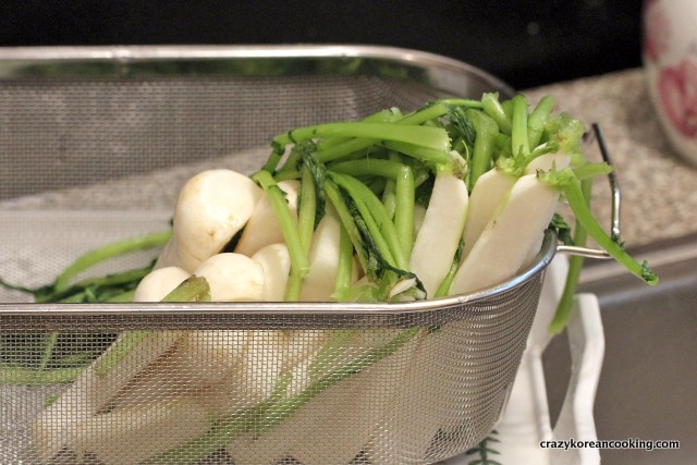7. Wash & drainWash each radish thoroughly 2-3 times. Wash the stems more throughly because they absorb much more salt than the root part. Drain all the water out by letting them sit in a strainer for an hour. |