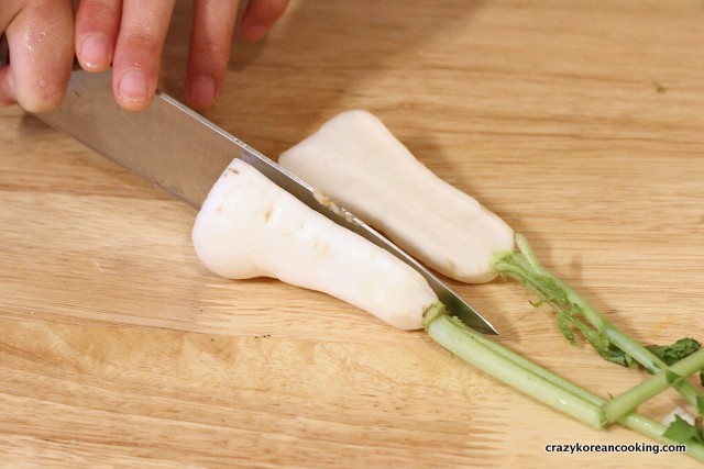 10. Cut green onionsWash and cut 3 green onions into halves lengthwise. These green onions don’t go into the seasoning directly. They will be used when you apply seasoning to the radishes. |