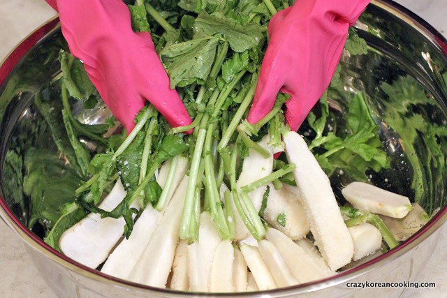 5. BrineQuickly rinse everything with water and drain water but don’t completely dry the radishes. Then, place the ponytail radishes in a large bowl and sprinkle ⅓ cup of salt. Mix everything well by hand. Wear rubber gloves so your hands don’t sting. *See tips for an alternative brining method. |
