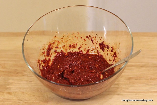 12. Make seasoningIn a medium bowl, mix 3 tablespoons of shrimp fish sauce (or anchovy fish sauce), minced garlic, minced ginger and sugar into the flour and gochugaru (red chili flakes) mix. You can use only one kind of fish sauce if you like. (e.g., If you only have anchovy fish sauce, use 6 tbs anchovy fish sauce instead of 3 tbs of anchovy sauce and 3 tablespoons of shrimp fish sauce. |