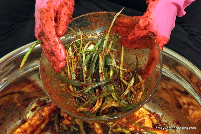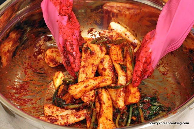 13. Apply seasoningIn large bowl, place some seasoning at the bottom. Place the radishes on top. Then, mix the seasoning with the radishes and the stems. Don’t pour all the seasoning at once in case there is too much seasoning for the amount of radish. Leave a small bit of seasoning for green onions. |