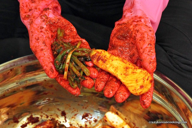 Use clean food-safe rubber cloves for brining cabbages and applying seasoning. Otherwise, your hands will sting from salt and chili peppers.