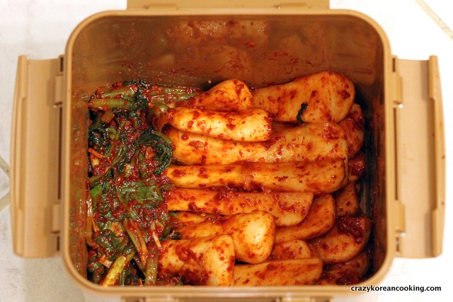 Remember that kimchi will produce gas and liquid as it is fermented. Leave some room in the container, or it will overflow.
