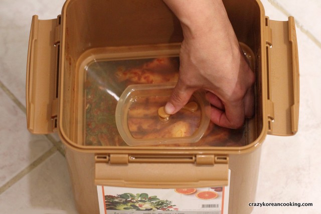 17. CoverCover the top with a plastic sheet (cling wrap). Close the lid. If you are making a small amount and will be eating it in a week or two, you don’t have to cover with a plastic sheet. The plastic sheet keeps the air out so it reduces a chance of getting molds. Alternatively, you can use a specialized Kimchi container with a vacuum seal. You can buy the container here. |