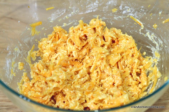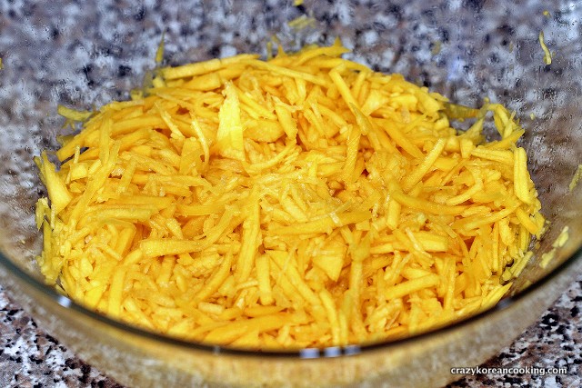 5. Add buchimgaru or flourYou should see about 2-3 spoons of liquid formed at the bottom. If there is not much liquid after 15-20 min, add 1 or 2 tablespoons of water. Add ½ cup of buchimgaru to the mix. You may need more or less depending on the pumpkin you use. Do not add too much water or buchimgaru. There should be just enough batter to bind the pumpkins shreds together. Let it sit for a few minutes. You can also use flour or sweet rice flour instead. |