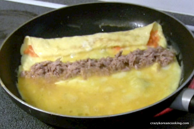 Add a strip of tuna (about 70g) and roll the egg to cover the tuna strip.
