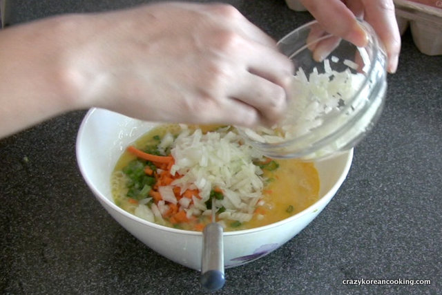 In a bowl, beat 5 eggs with ¼ tsp of salt, a pinch of pepper and chopped vegetables. You can also add 1 tsp of rice wine to get rid of eggy smell.