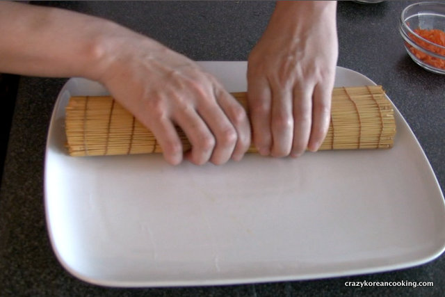 Place the rolled egg in a flat bamboo mat and roll the mat over and around. Gently squeeze around the outside to shape the roll. If you don’t have a bamboo mat, you can skip this. Let it cool down for at least 10 min.