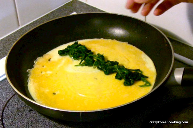 Roll egg to cover spinach Move to one side Pour more mix | |