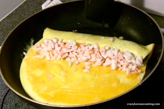 Add crab meat Roll egg to cover crab meat | |