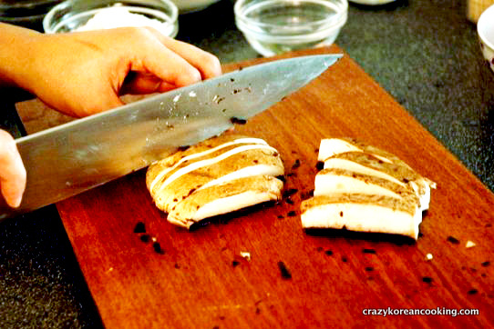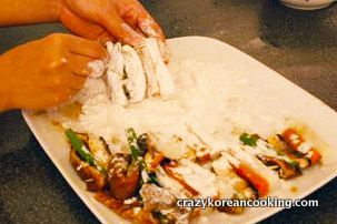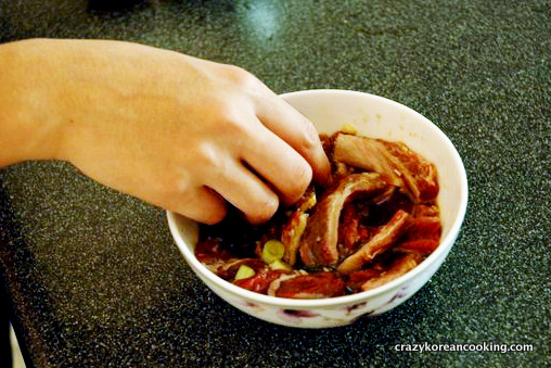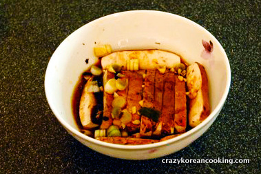 6. Make marinade.Mix 4 tablespoons of soy sauce, 2 tablespoons of sugar, 2 tablespoons of water, 1 tablespoon of sesame oil, 1 teaspoon of chopped garlic, 1 teaspoon of chopped green onions & ¼ tsp black pepper in a bowl. |