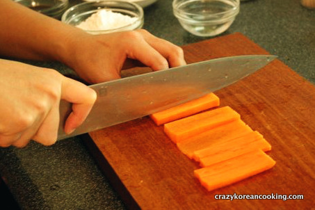 2. Prepare CarrotsPeel and wash 1 large carrot. Cut them into 2” (or 5 cm) long, ⅜” (or 1 cm) wide and ⅜” (or 7 mm) thick strips. |