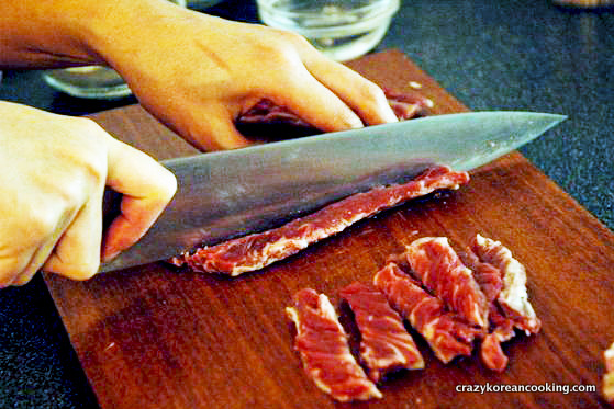 5. BeefCut into 2” (or 5 cm) long and ⅜” (or 1 cm) wide strips. |