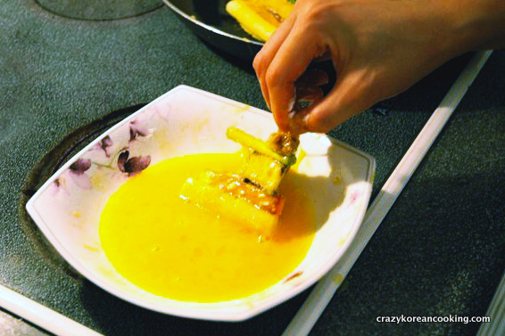 12. Coat with eggsBeat 3 eggs with a pinch of salt and pepper. Then, coat the flour-coated skewers in the egg mixture. |