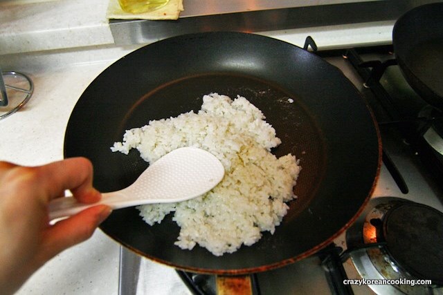 2. PreparationAdd one cup of cooked rice. Spread the cooked rice as flat as possible on the pan. |
